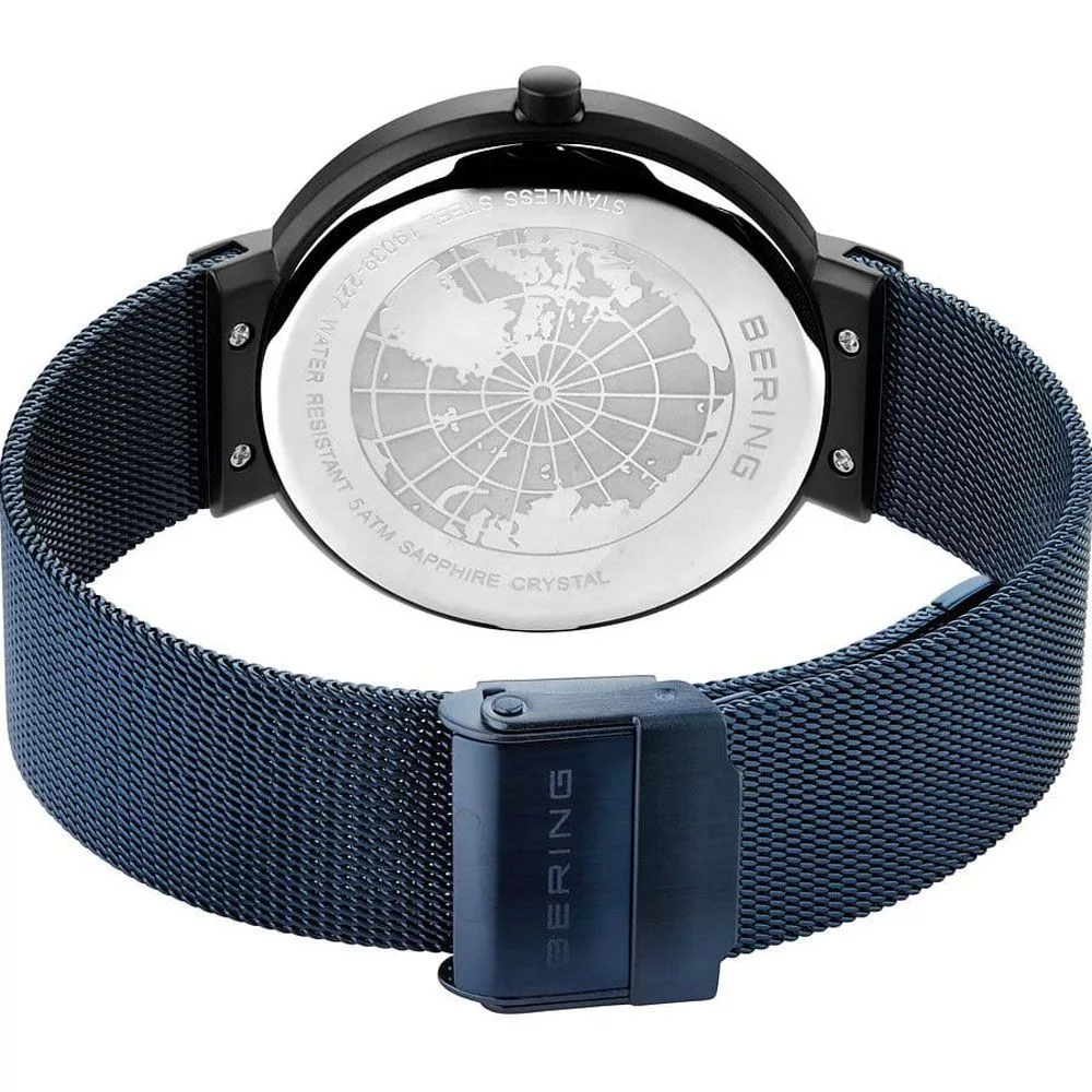 Il materiale della cassa dell'orologio Bering Classic orologio da uomo 19039-327 è acciaio inossidabile, il suo colore è nero, il materiale del cinturino è acciaio inossidabile e il suo colore è blu. Il diametro della cassa dell'orologio è 39 mm, la sua forma è ruota. Il vetro dell'orologio è zaffiro (antigraffio), il suo meccanismo è quarzo e la sua resistenza all'acqua è 5 atm (50 m) (altamente resistente alle cadute).