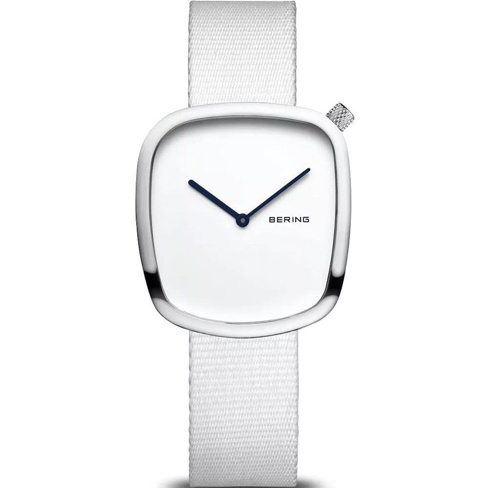 Il materiale della cassa dell'orologio Bering Ocean Pebble orologio da donna 18034-007 è acciaio inossidabile, il suo colore è argento, il materiale del cinturino è tessuto e il suo colore è bianco. Il diametro della cassa dell'orologio è 30 mm, la sua forma è ellittico. Il vetro dell'orologio è zaffiro (antigraffio), il suo meccanismo è quarzo e la sua resistenza all'acqua è 3 atm (30 m) (senza gocciolamento).