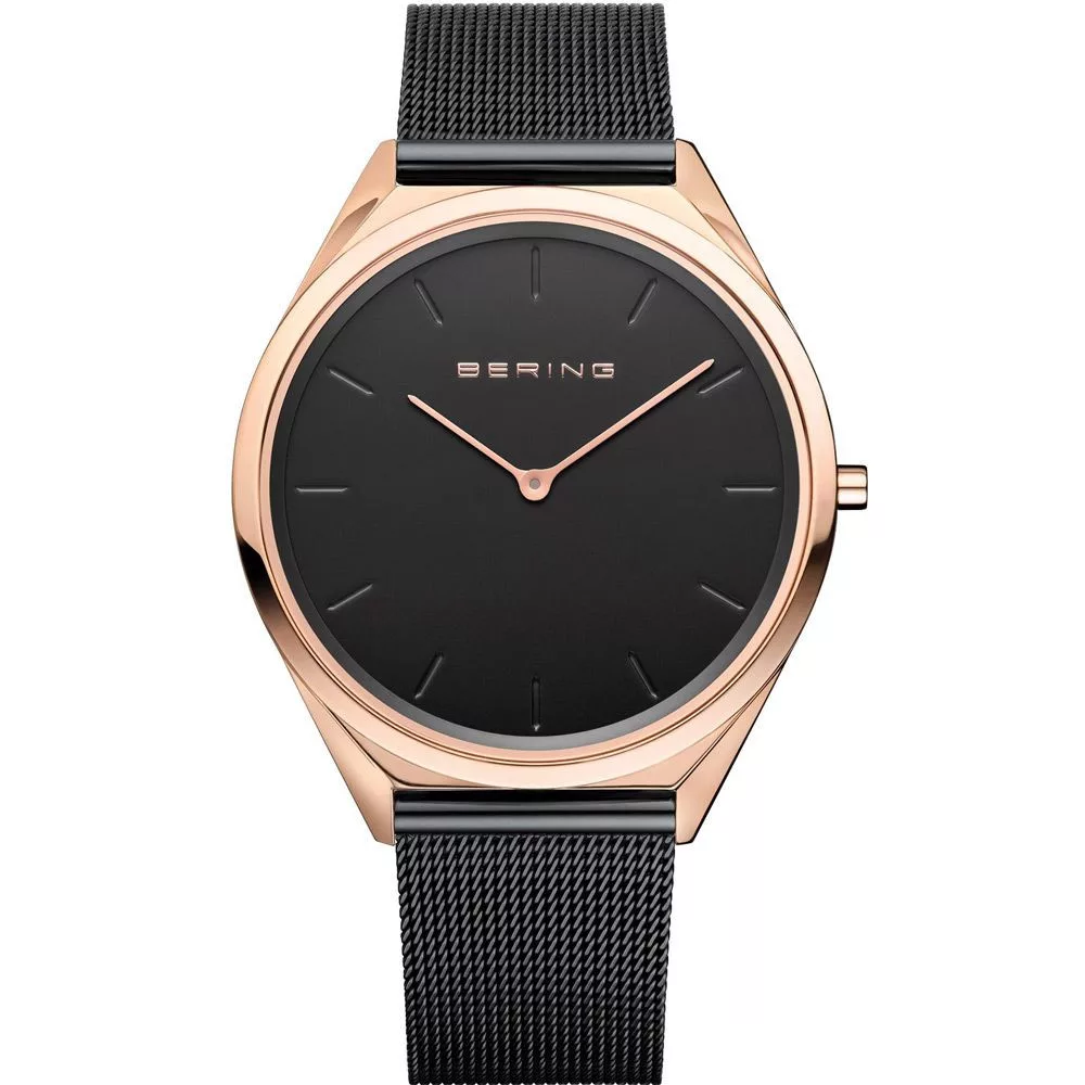 Il materiale della cassa dell'orologio Bering Ultra Slim unisex orologio 17039-166 è acciaio inossidabile, il suo colore è oro rosa, il materiale del cinturino è acciaio inossidabile e il suo colore è nero. Il diametro della cassa dell'orologio è 39 mm, la sua forma è ruota. Il vetro dell'orologio è zaffiro (antigraffio), il suo meccanismo è quarzo e la sua resistenza all'acqua è 3 atm (30 m) (senza gocciolamento).