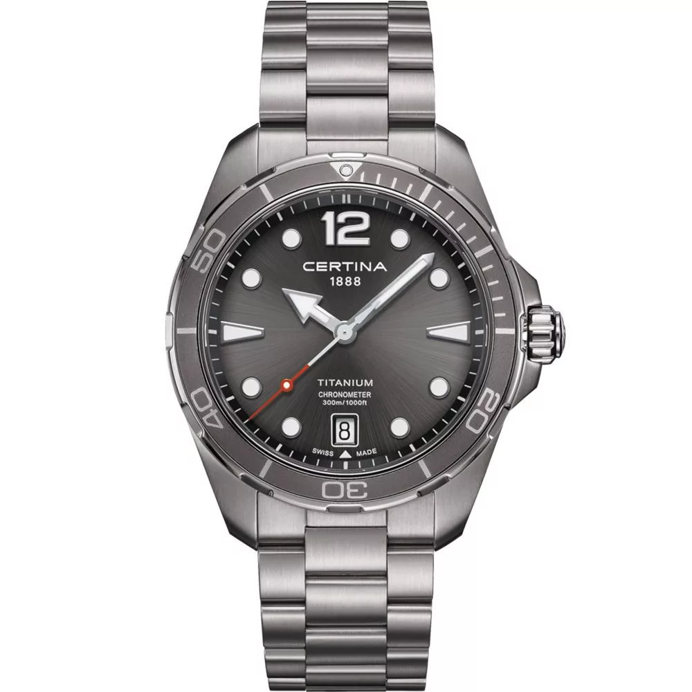 Il materiale della cassa dell'orologio Certina DS Action orologio da uomo C032.451.44.087.00 è titanio, il suo colore è grigio, il materiale del cinturino è titanio e il suo colore è grigio. Il diametro della cassa dell'orologio è 43 mm, la sua forma è ruota. Il vetro dell'orologio è zaffiro (antigraffio), il suo meccanismo è quarzo e la sua resistenza all'acqua è 30 atm (300 m) (adatto per le immersioni).