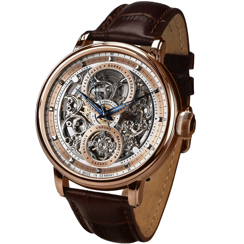 Il materiale della cassa dell'orologio Poljot International Hermitage orologio da uomo 7500.1940613 è acciaio inossidabile, il suo colore è oro rosa, il materiale del cinturino è pelle e il suo colore è marrone. Il diametro della cassa dell'orologio è 43 mm, la sua forma è ruota. Il vetro dell'orologio è zaffiro (antigraffio), il suo meccanismo è meccanico a carica manuale e la sua resistenza all'acqua è 5 atm (50 m) (altamente resistente alle cadute).