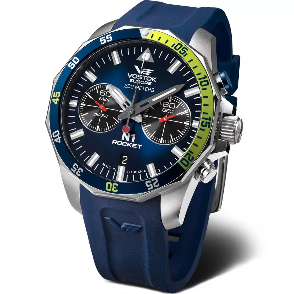 Il materiale della cassa dell'orologio Vostok Europe N1 Rocket orologio da uomo 6S21-225A708-SB è acciaio inossidabile, il suo colore è argento, il materiale del cinturino è silicio e il suo colore è blu. Il diametro della cassa dell'orologio è 46 mm, la sua forma è ruota. Il vetro dell'orologio è cristallo (difficile da graffiare), il suo meccanismo è quarzo e la sua resistenza all'acqua è 20 atm (200 m) (adatto per le immersioni).
